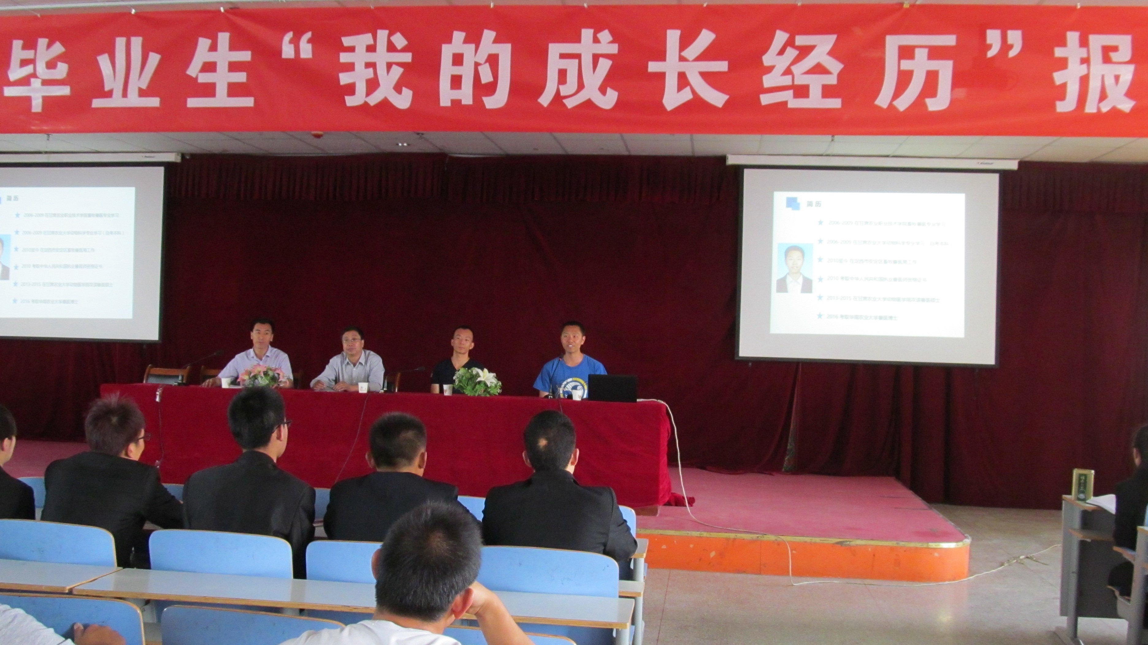 2016年6月16日下午4点半,畜牧兽医系优秀毕业生“我的成长经历”报告会在学院1号楼7楼学术报告厅成功举办,此次报告会邀请到我系06级学生董震、张晓龙两位优秀校友,分别从“不惧未来迎接挑战”和“立足现实,完善自我,心存感恩,回报社会”两个方面为全体在学生分享他的求学心得和成长经历,以自身经历勉励学弟学妹们。