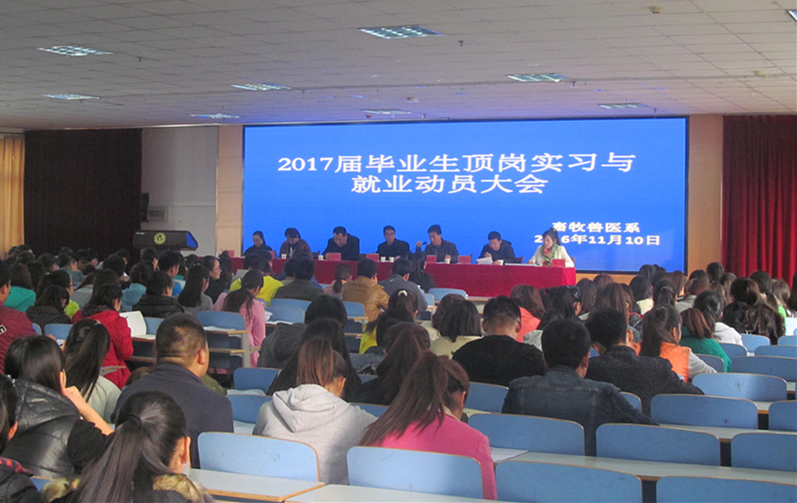 2016年11月10日,畜牧兽医系在一号楼7楼多功能厅举办了2017届毕业生顶岗实习暨就业动员大会。会议由系党总支书记王宇翔主持,顶岗实习指导老师,毕业班班主任参加了会议。