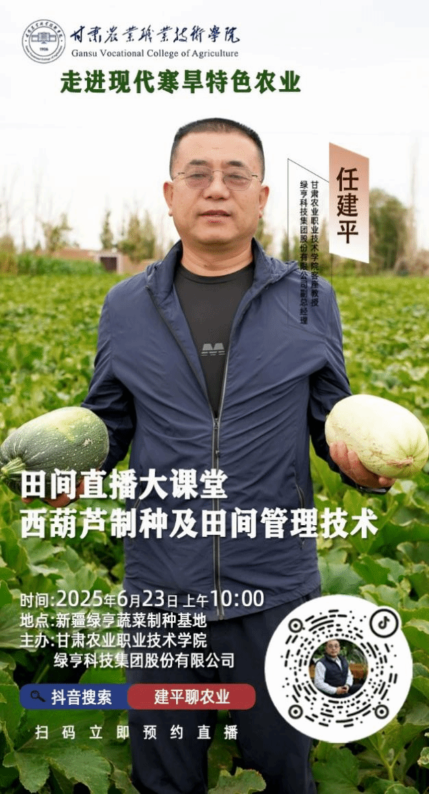 此次活动直播地点在新疆阿勒泰绿亨集团制种基地,由我校客座教授、绿亨科技集团股份有限公司副总经理任建平博士围绕西葫芦制种及田间管理技术进行直播授课,将企业真实生产场景和案例引入课堂教学,为学生带来了全新的学习体验。