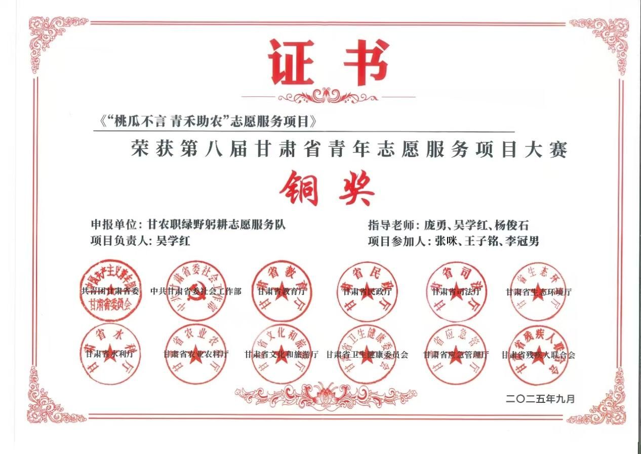 9月9日,由团省委主办的第八届甘肃省青年志愿服务项目大赛在国网甘肃省电力公司电力科学院圆满落幕。本次大赛共有来自全省各行业选送的580多个项目参加,我校园林与建筑学院团总支绿野躬耕志愿服务队申报的“桃瓜不言 青禾助农”志愿服务项目,经多轮激烈角逐,喜获铜奖。