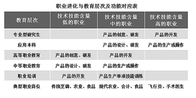从职业进化与教育层次分析,专业型研究生教育要完成产品的创意与研发,应用本科要开展产品的设计与研发,高等职业教育要进行产品的开发,中等职业教育实现产品的生产或操作,职业培训完成产品生产单项技能训练,这些不同层次的教育构成了完整的职业教育体系。同时,不同的职业工作领域由于其科学、技术、技能进步的程度不一样,使同一层次的职业教育在一定阶段对应的教育功能并不完全相同(见下表)。