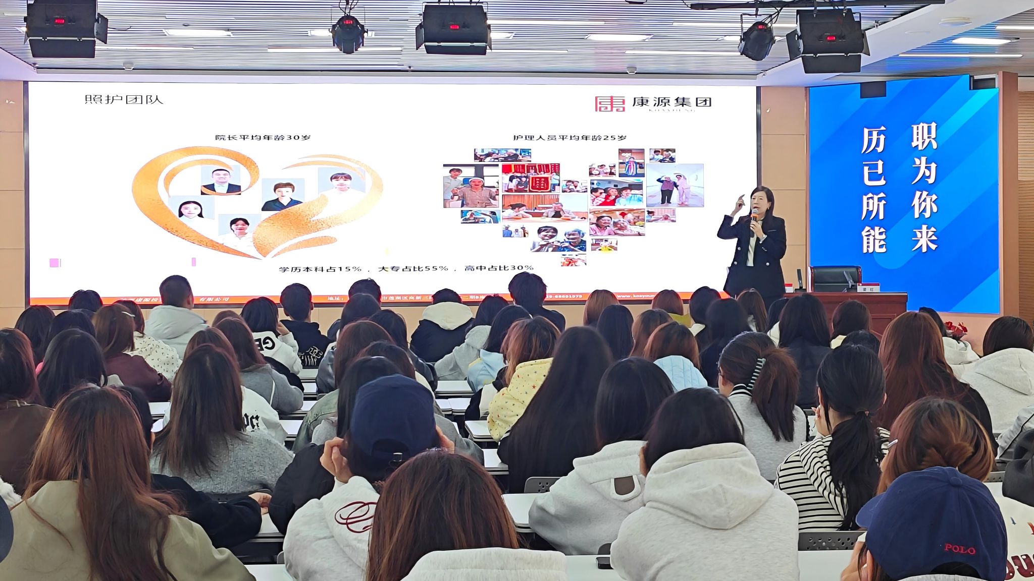 随后,企业工作人员结合自身丰富的养老行业从业经历,从中国养老政策演变、人口老龄化趋势、银发经济发展前景等方面展开宣讲,详细介绍了康源集团在养老教育、机构运营、社区服务等板块的实践成果,并重点分享了企业在“现代学徒制”模式下的人才培养机制,包括校企双轨培养、日本介护技能实习、职业发展路径设计等内容,鼓励同学们树立积极的职业观念,把握养老产业发展的时代机遇。