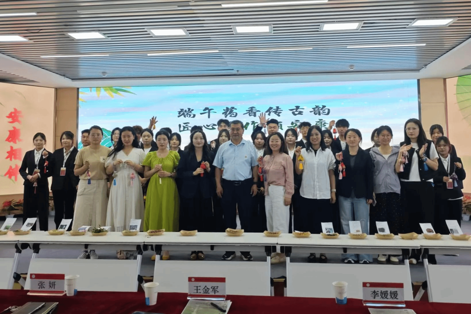 活动在活力四射的开舞蹈及歌声中中拉开帷幕,民俗知识讲解环节,主持人结合图文与视频,生动讲述端午节起源、习俗,重点阐释香囊、五彩绳的文化寓意。在手工制作区,师生们在指导下大展身手:串珠、编织五彩绳、缝制香囊,现场药香与欢笑声交织。艾叶、丁香等中药材经裁剪、填充,化作承载安康祝愿的香囊;五色丝线在指尖编成独特腕饰,彩珠串联成精美饰品。活动尾声,百余件手工艺品陈列展示,创作者分享制作心得与对传统文化的新感悟。此次活动将文化传承与实践体验相结合,让师生在动手过程中感受传统技艺的魅力,同时激发了大家对中华优秀传统文化的热爱。