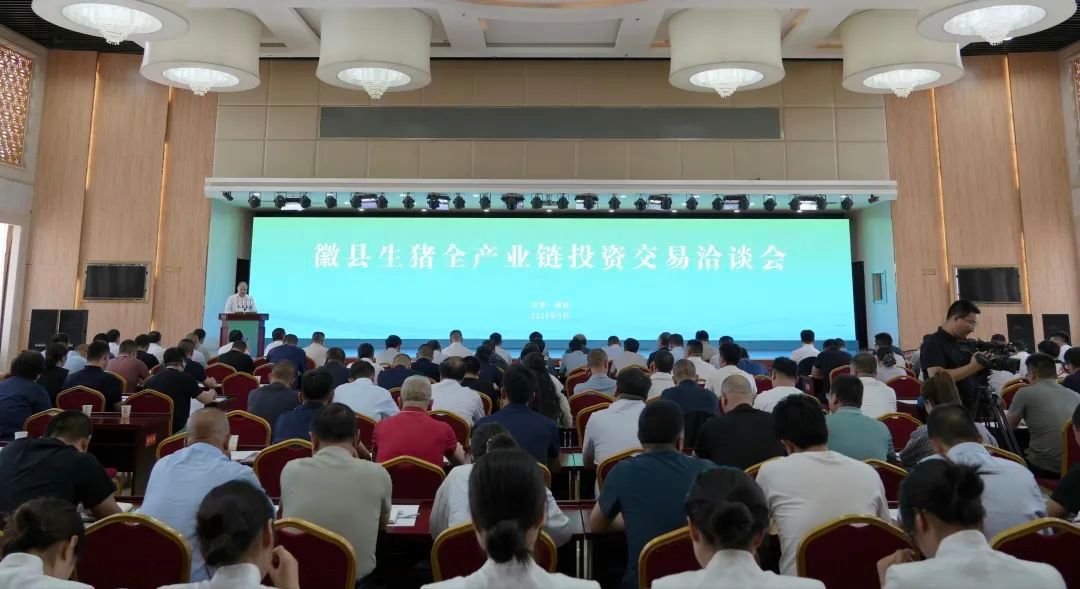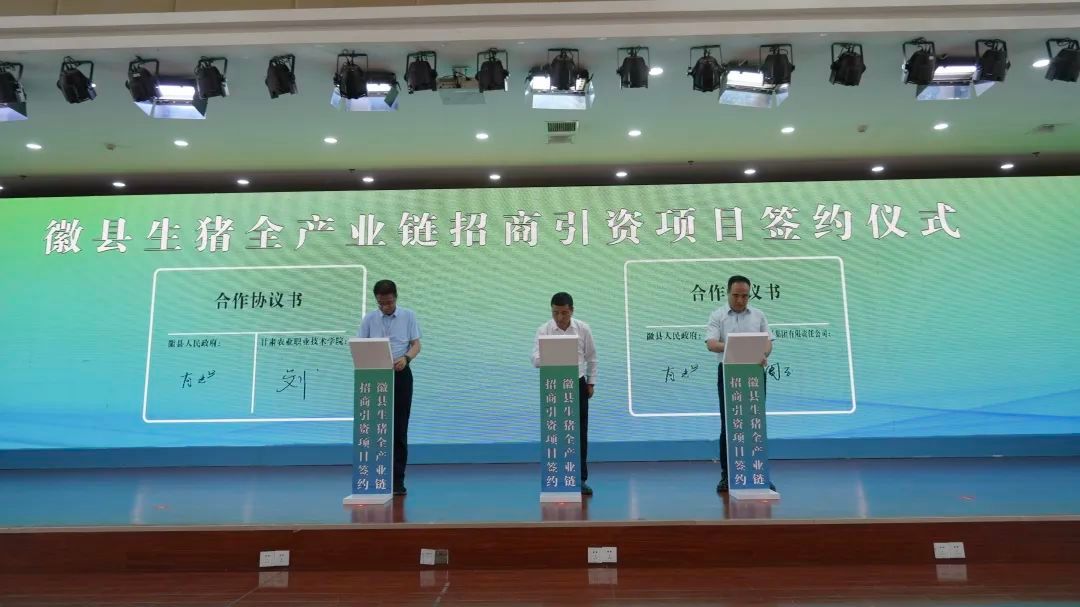 5月25日,徽县召开生猪全产业链投资交易洽谈会,学校党委委员、副校长刘宗盛受邀参加了洽谈会并签订了校地合作协议。陇南市政府、徽县县委与政府、省农业农村厅、省畜牧兽医总站、省农科院、省农垦集团等单位负责人、国际国内生猪养殖专家与学者、企业负责人、金融单位负责人及相关媒体单位150多人参加了会议。
