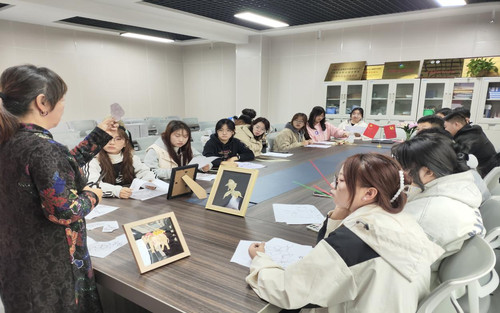 冉艺飞老师详细地向同学们展示了麦秆画的制作技巧。同学们认真观看冉老师的示范,手中的工具也随之挥舞起来,现场沉浸在浓厚的艺术创作氛围中。