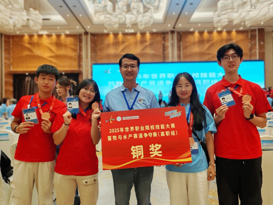 8月18至22日,2025年世界职业院校技能大赛畜牧与水产赛道争夺赛在福建农业职业技术学院举办,来自全国30个省(自治区、直辖市)和新疆生产建设兵团的102支参赛代表队参赛。畜牧科技学院与动医科技学院联合组队,学生李佳、杨瑞江、杨银杏、王康代表参赛,最终获得铜奖。