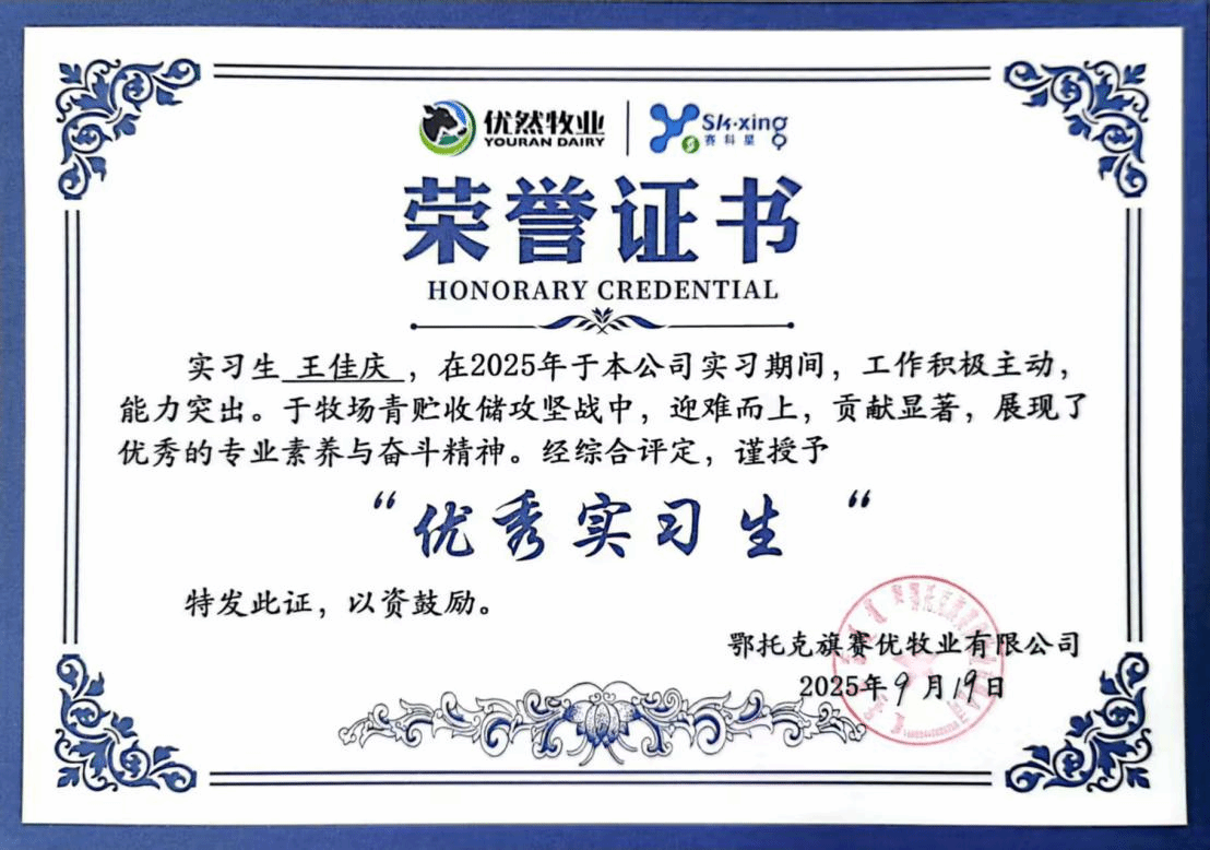 近日,我院畜牧科技学院23畜牧兽医3班王佳庆同学在鄂托克旗赛优牧业有限公司的生产性实习中,凭借其扎实的专业技能、勤勉的工作态度和突出的综合表现,荣获该公司“优秀实习生”称号,并收到企业发来的热情洋溢的表扬信。与此同时,王佳庆同学在校期间因学业成绩、科技创新等方面表现卓越,荣获2024-2025学年国家奖学金。这一系列成绩的取得,是我院坚持立德树人、深化产教融合、强化党建引领下结出的又一硕果。
