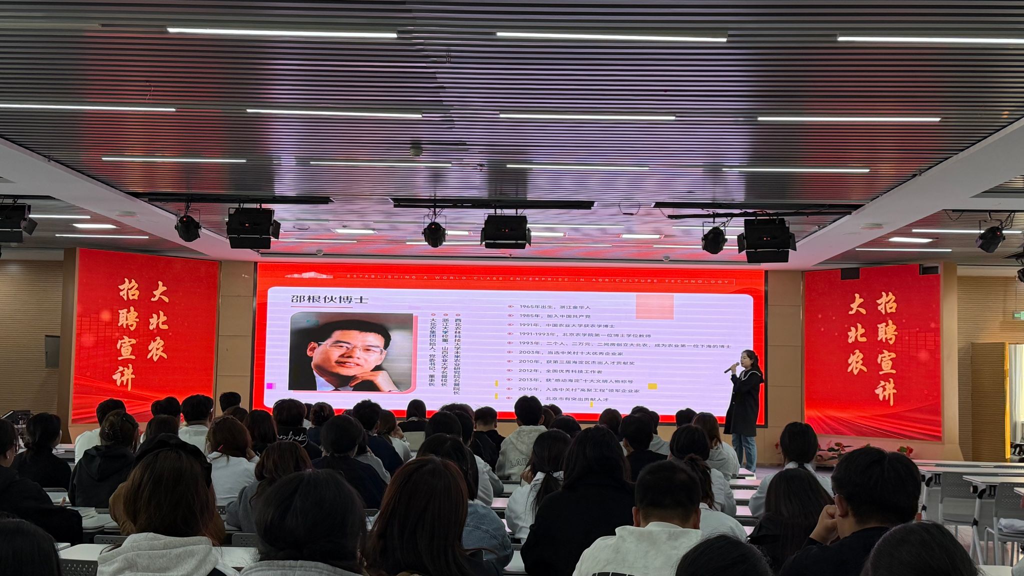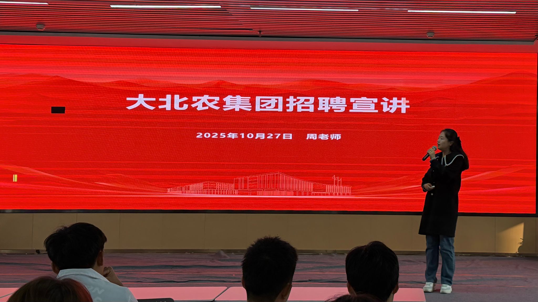 2025 年 10 月 27 日,我院于英甲楼 7 楼学术报告厅成功举办大北农集团西北区专场招聘会,23 级和24 级学生踊跃参与,现场氛围热烈。宣讲会伊始,企业负责人周培培老师通过生动详实的 PPT 演示,从发展历程、核心企业文化、业务布局到未来战略规划等方面,全方位展现了大北农集团在行业内的领先地位与发展潜力。其卓越的行业成就、独具特色的企业文化,深深吸引了在场学生的关注,引发热烈反响。