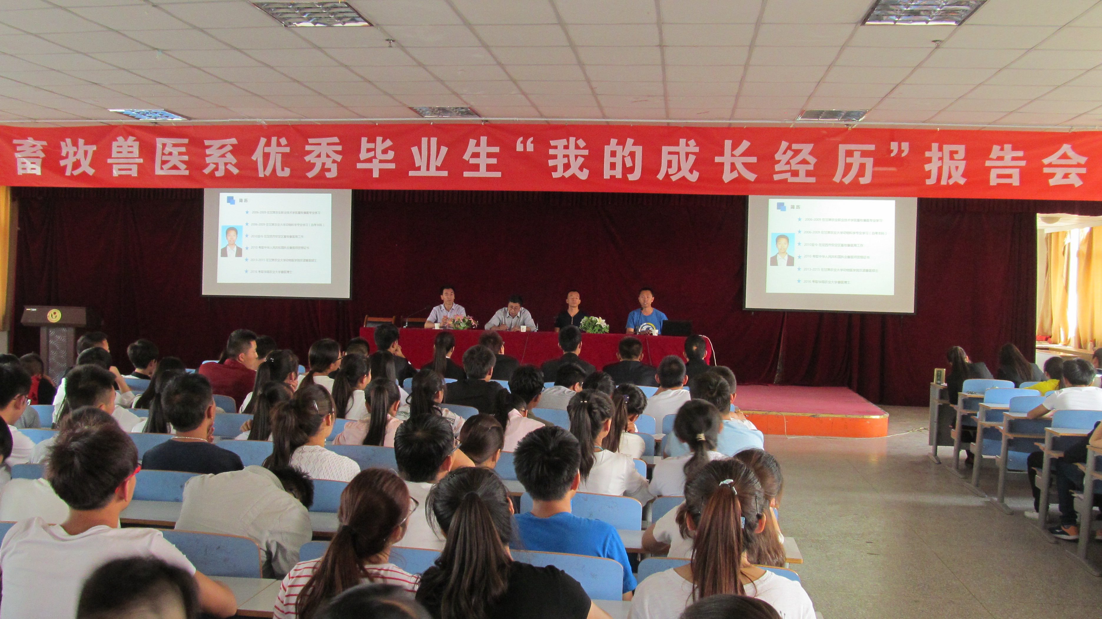 2016年6月16日下午4点半,畜牧兽医系优秀毕业生“我的成长经历”报告会在学院1号楼7楼学术报告厅成功举办,此次报告会邀请到我系06级学生董震、张晓龙两位优秀校友,分别从“不惧未来迎接挑战”和“立足现实,完善自我,心存感恩,回报社会”两个方面为全体在学生分享他的求学心得和成长经历,以自身经历勉励学弟学妹们。