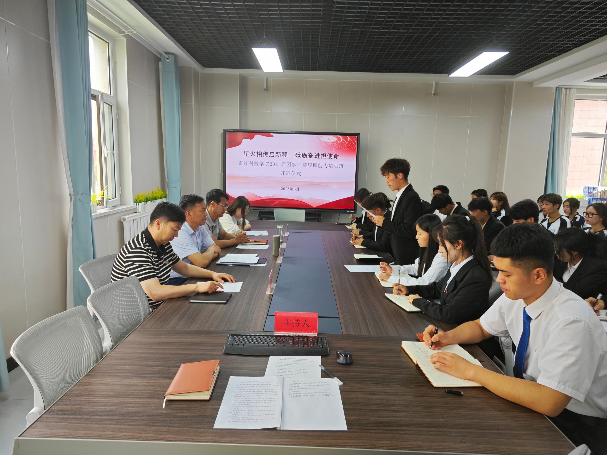为加强学生干部队伍建设,提升新任学生干部的综合素质与服务能力,畜牧科技学院于2025年6月6日在经权楼415会议室举行2025届学生干部培训开班仪式。学院党总支书记班子成员、团总支书记及2025届团总支、学生会、各班团干部参加了培训会,培训班开班仪式由学院团总支书记主持。