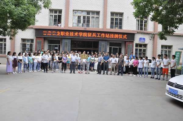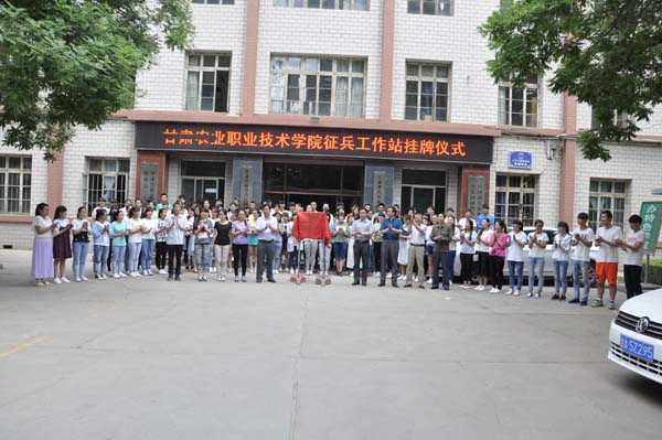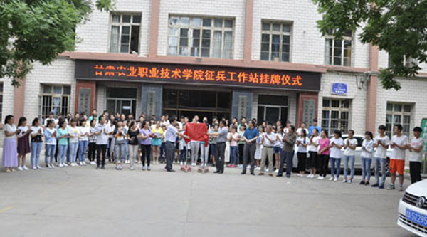 为全面落实中央军委国防动员部、教育部联合下发的《关于进一步做好大学生征兵工作的通知》精神,进一步加强我校大学生征兵工作组织和领导,推进大学生征兵工作深入开展。6月13日下午,学院在原办公楼前举行“甘肃农业职业技术学院征兵工作站成立暨挂牌仪式”。 副院长张守润、学工部部长李明达、招生就业处处长王建鹏、经济管理系书记薛骞、畜牧兽医系书记李举章和部分老师、学生代表参加了挂牌仪式。仪式由学生处副处长王金军主持。