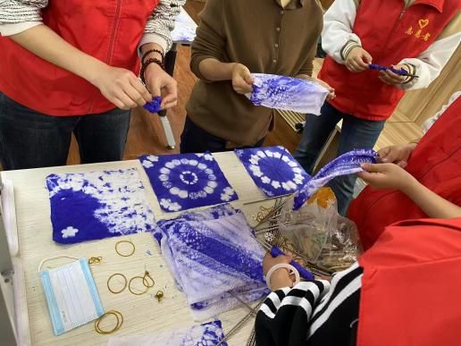 活动伊始,高职志愿者们结合自身专业优势,为小学生们带来了一场别开生面的"技能秀"。花卉生产与花艺专业专业老师及学生现场演示了简易的扎染技术,并介绍了扎染起源的古老传说,到其在不同历史时期的发展脉络,再到各地风格迥异的扎染特色,生动有趣的讲解让孩子们对扎染有了初步认识,也成功点燃了他们对这项传统技艺的好奇心。