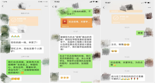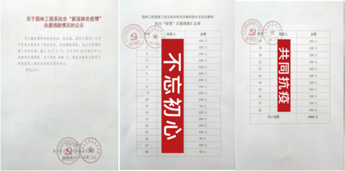 大义面前,大爱浮现。一个支部就是一个堡垒,一名党员就是一面旗帜。在教工党支部、师生联合党支部发出的捐款倡议之后,广大党员和教师积极响应,纷纷解囊相助,以实际行动践行“不忘初心、共克时艰”。此次捐款收到来自18名党员、11名教师共计4300元的爱心资金。园林工程系窦宗信老师表示:“在疫情防控这个关键时刻,作为一名党员能够与同事奋战在服务学生的第一线是一种荣誉,更是一种责任,一份担当。相信我们万众一心,定能众志成城,共克时艰。”张庆霞老师表示:“疫情面前没有局外人,相信在党的坚强领导下,经过大家的共同努力,我们终将迎来春暖花开!”