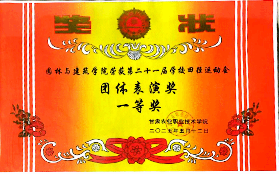 5月12日,我校第21届田径运动会开幕式上,我院百人舞蹈惊艳全场!以“绿野助梦,跃动青春”为主题的“接力华尔兹 青春心飞扬”舞蹈表演,凭借精湛编排与默契演绎,一举斩获团体表演一等奖。