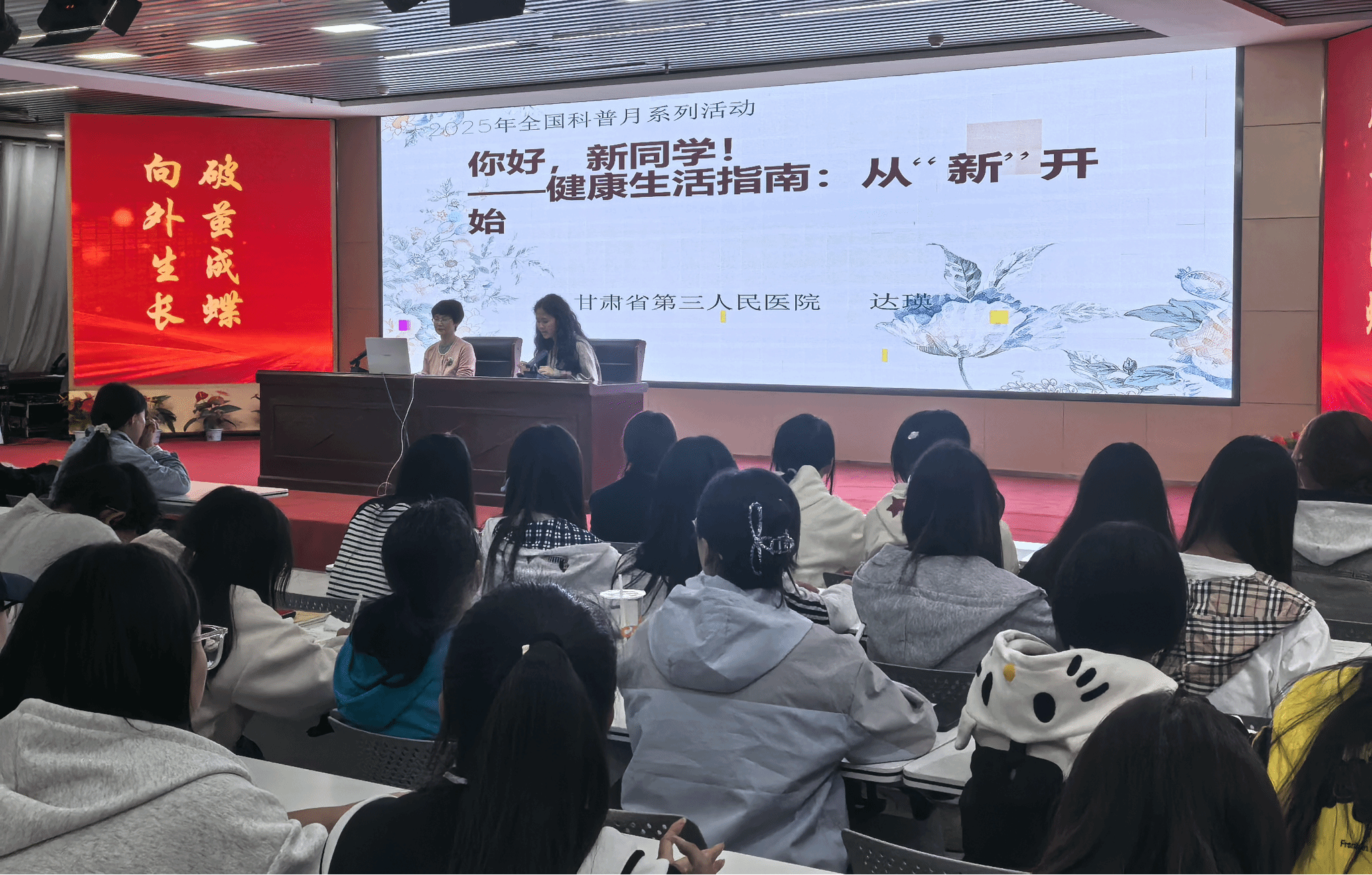 为关爱女大学生身心健康,提升其健康素养与自我保健意识,9月24日,园林与建筑学院特邀甘肃省第三人民医院达主任,在英甲楼学术报告厅为学院2024级、2025级全体女生举办了一场以“健康生活指南:‘重’新开始”为主题的女生健康知识科普讲座。本次活动旨在引导同学们以科学的态度“重新”认识自我,开启健康、自信的大学新生活。