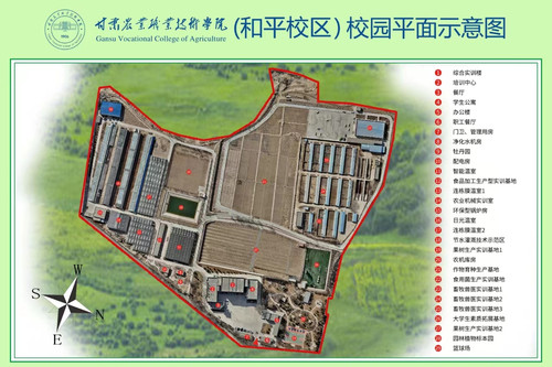 甘肃农业职业技术学院和平校区占地176亩,现有综合实训楼1栋建筑面积8320.83 m2,大楼中建有农产品质量安全检测中心1个709 m2,植物组织培养中心1个709 m2, 动物解剖实验中心1个589 m2,中药制药生产示范车间1个355 m2,并具备开展社会化服务培训的基本条件。校区管理用房建筑面积761.40 m2。智能温室1栋1728 m2,日光温室8栋共4800 m2,拱棚2栋共480m2,养殖场26亩,果园30亩,作物育种试验田30亩,园林植物标本园占地7亩, 灌溉用水5000m3蓄水池1座,饮用水255 m3蓄水窖1个,示范性农业技术服务站(包括农业物联网、多媒体教室、土壤肥料等的监测仪器)1个,空气能供暖锅炉房1座(供暖面积1万平米)。兰州市发改委已批复我校教育强国项目-产教融合大楼建设项目,总投资1.2个亿,我校按照上级部门要求,计划于今年7月开工建设。