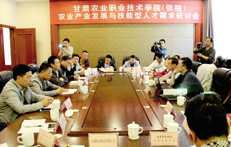 由农业技术系主办的甘肃农业职业技术学院甘肃农业产业发展与技术技能型人才需求研讨会5月21日在张掖举行,来自张掖、酒泉、定西等地的15位行业管理者、企业领导人和一线专家参加研讨活动,针对种子、马铃薯、花卉、农产品加工、农业生产资料经营等农业产业的现状与未来发展、技术技能型人需求等做了深入探讨。本次研讨会是我院职业教育活动月的重要活动之一,也是农业技术系继酒泉种子生产与经营专业建设及校企合作研讨会、武威种子生产与经营专业及课程建设研讨会之后在校企合作,工学结合改革方面的重要举措。苗世林副院长和农业技术系教师一行15人参加了研讨。会议结束后苗世林副院长一行考察了张掖地区的部分农业企业,并看望了我院的顶岗实习学生。