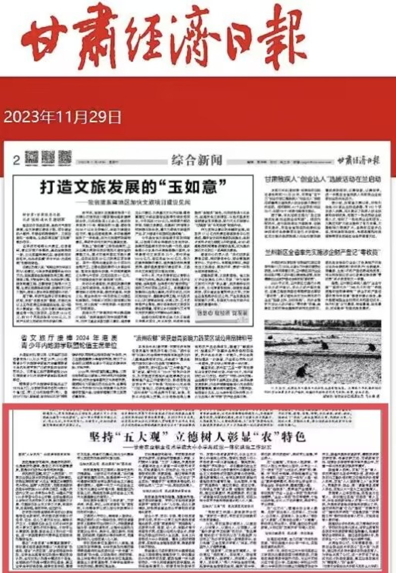 11月29日,《甘肃经济日报》刊发题为《坚持“五大观” 立德树人彰显“农”特色——甘肃农业职业技术学院大中小学思政课一体化建设工作纪实》专题报道。文章紧扣“大中小学思政课一体化建设”,从大历史观教学、大思政观育人、大理论观铸魂、大“五育”观塑性以及大融通观串联“五大观”出发,系统阐述了学校在立德树人、教育强国建设方面的农职特色和农职经验,是学校致力于推进思想政治教育工作发展的重要一步,是学校深入贯彻落实习近平总书记在思想政治理论课教师座谈会关于“要把统筹推进大中小学思政课一体化建设作为一项重要工程”重要讲话精神的关键一招。