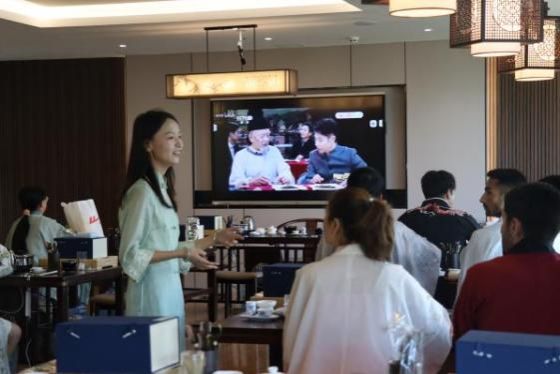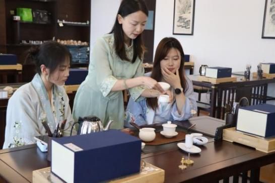 活动从一捧春茶开始。工作人员手把手教学行茶十式,并在温杯、投茶、注水、出汤环节中提醒学生仔细观察白瓷杯中舒展的茶叶。在此过程中参与人员耐心体会职业技能“在细微处见真章”的主要内核,感受“精行俭德,天人共饮”的中国茶道精神,体验茶文化细致曼妙的全过程。暮色初临时分,众人围坐品茗。参与活动的学生共同观看《茶圣陆羽与茶叶》的中国故事,伴着故事的推进演绎,学生轻抿自泡的春茶,体悟茶道“精行俭德”的精神。