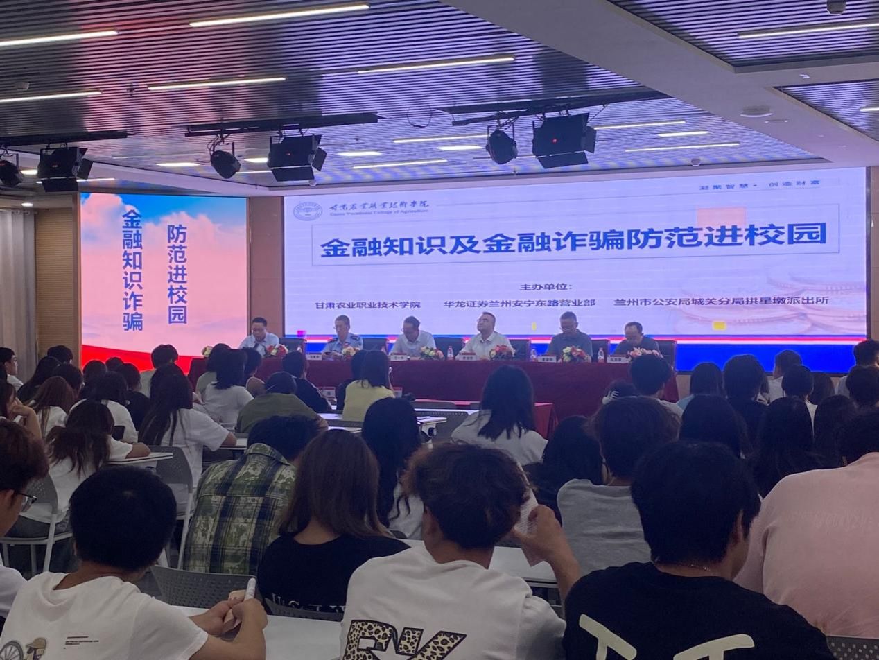 为深入贯彻落实中央金融工作会议精神及新“国九条”部署要求,推动投资者教育纳入国民教育体系,2025年5月20日下午,由华龙证券兰州安宁东路营业部、兰州市公安局城关分局拱星墩派出所与我校三方共同举办的“投资者教育进百校——走进甘肃农业职业技术学院”,本次活动在学院英甲楼7楼学术报告厅成功举办。经贸与电商学院百余名师生参与活动,共同学习金融知识,筑牢反诈防线。