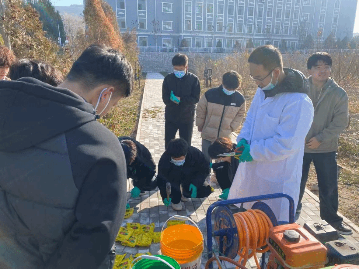 作为果园冬春季清园的关键技术措施,石硫合剂喷洒是本次实践的核心内容。石硫合剂作为农业生产中常用的无机硫制剂,在冬季果树落叶后施用,能有效铲除枝干病菌、虫卵,降低来年病虫害发生基数。活动前,朱学刚老师为学生系统讲解了石硫合剂的配比原理、使用特性及施药安全规范;在桃园,学生们分工协作,从按比例精准配制药剂、调试机动喷雾设备,到规范穿戴白大褂、口罩、护目镜、手套等防护装备,再到把控喷头与枝干30厘米左右的距离、重点喷布树皮缝隙和枝杈处等实操细节,每一步都严格遵循植保操作标准,让学生快速掌握了冬季清园施药的核心技能,实现了理论知识向实用技能的转化。
