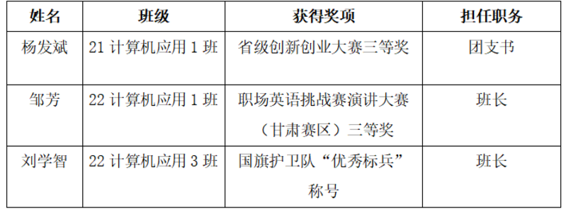为落实立德树人根本任务,选树优秀大学生典型,激励广大青年学生勤奋学习、健康成长和全面发展,培养德智体美劳全面发展的社会主义建设者和接班人,根据《普通高等学校学生管理规定》(教育部第41号令)、《甘肃省教育厅关于做好2023年度全省高校三好学生推荐工作的通知》精神,学院开展2023年度全省高校三好学生推荐工作。经班主任老师推荐,学院党政研究决定推荐杨发斌等三位同学,现公示如下:
